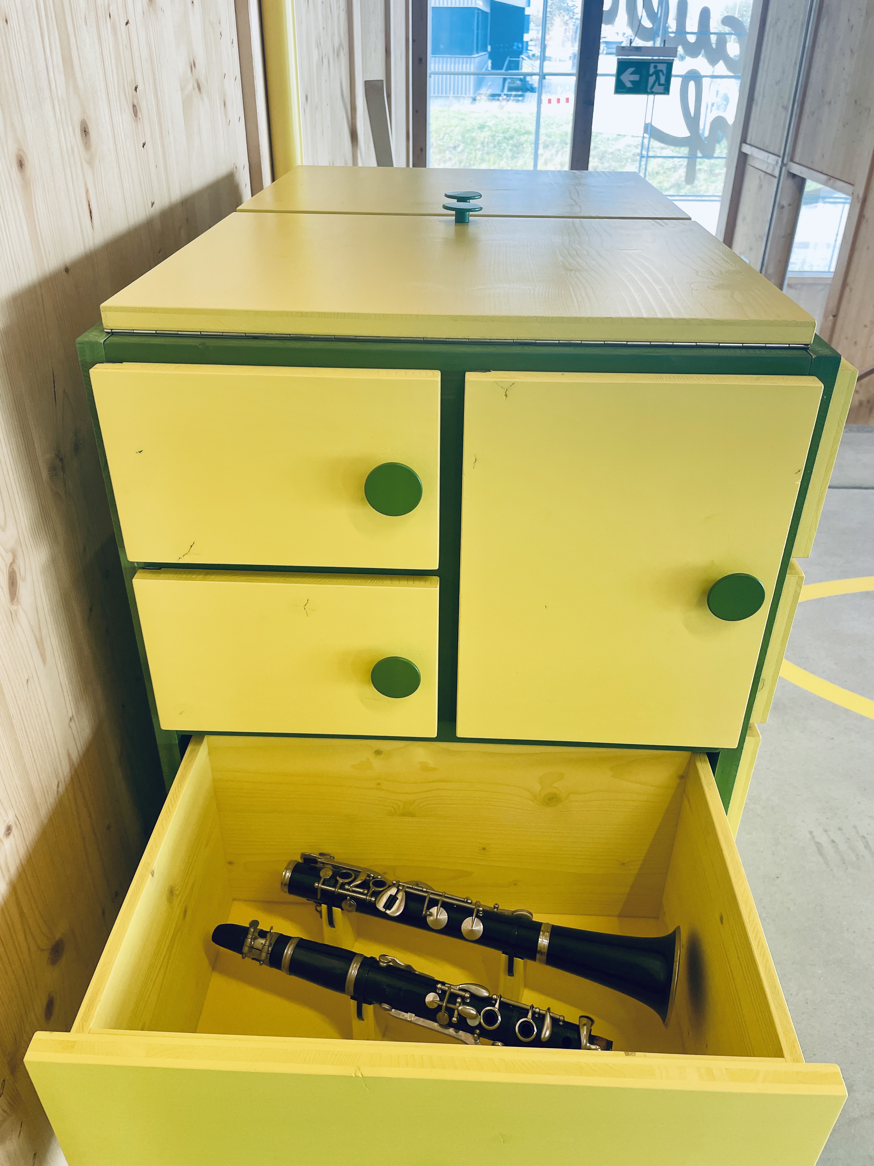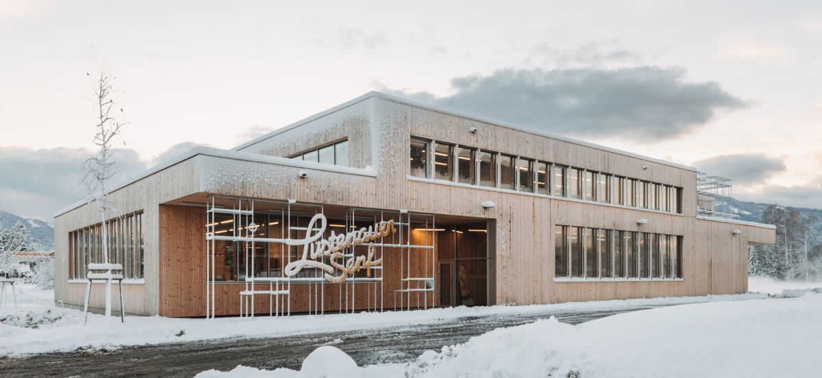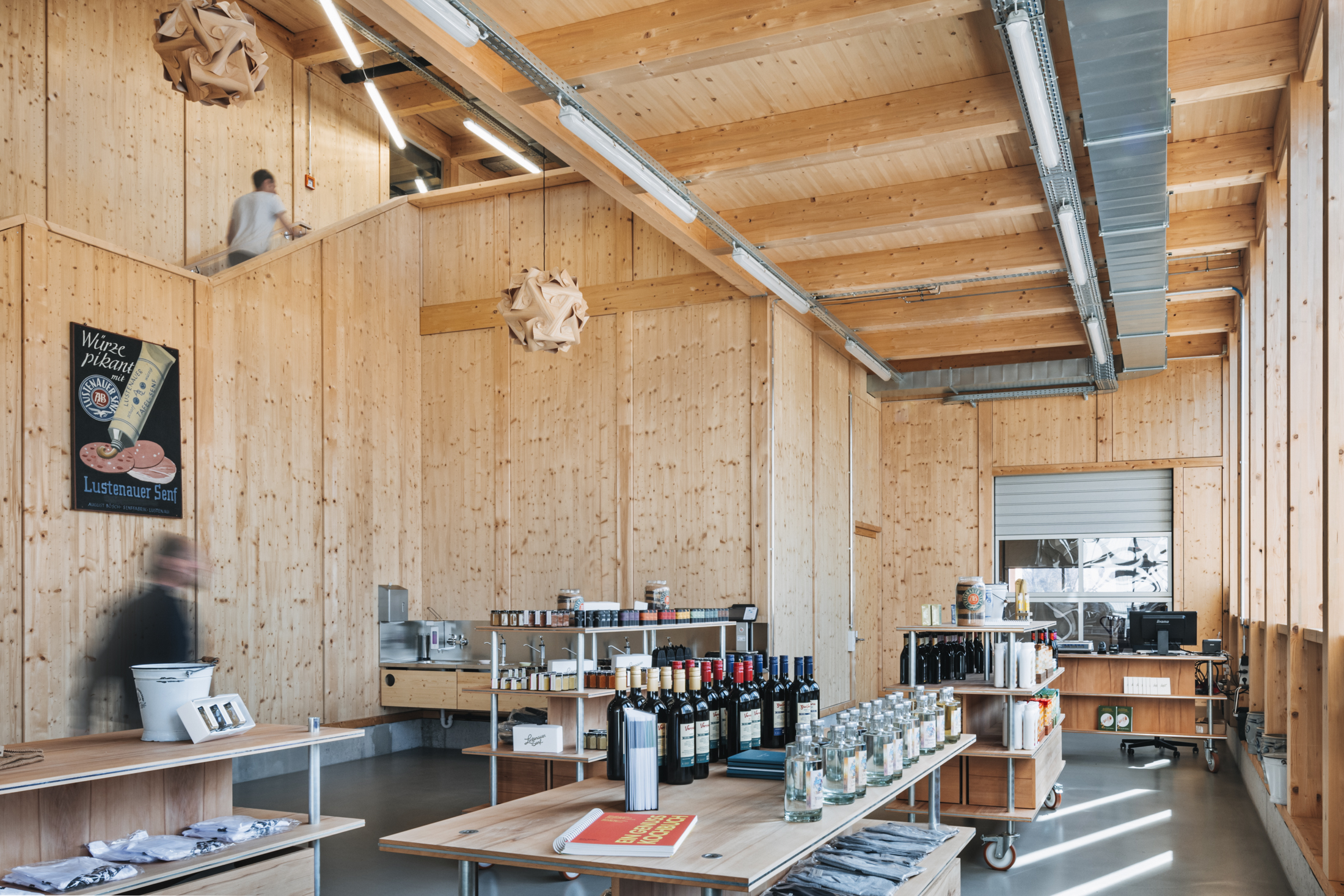 Uns erinnert die Architektur mit dem Atrium, das den Klang der Gespräche aus dem Senfladen in das obere Stockwerk trägt, an ein Holzinstrument. Dabei wäre eher die Klarinette für das Unternehmen bezeichnend, sie findet sich sogar im Senfmuseum, das mit historischen Informationen und Senfsäcken zum Reingreifen in einem Rundgang durch Lagerraum und Produktion zu mäandern scheint. Am Ende des Rundgangs gelangt man zu einer Kommode, die neben der Klarinette u.a. auch einen QR-Code beinhaltet, der auf den Vorarlberger Mundart Song LUSTNAUA SENF des Dornbirner Rappers Justin Winsauer aka DORABIRA MC verweist. Zufällig entdeckten die Böschs die Hommage an ihre Marke, deren Tradition und Verwendung und integrierten sie kurzerhand in ihr Museum.