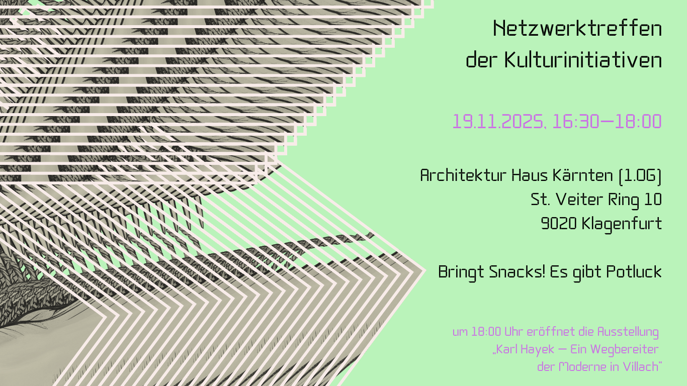 Das monatliche Netzwerktreffen ist ein Ort für Austausch, Sichtbarkeit und gegenseitige Stärkung freier Kulturarbeit in Kärnten/Koroška. Sie entstanden aus der kulturpolitischen Stagnation der Stadt Klagenfurt und dem dringenden Bedürfnis, gemeinsam an aktuellen kulturpolitischen Fragen zu arbeiten, voneinander zu lernen und neue Formen der Zusammenarbeit zu entwickeln. Themen und Inhalte entstehen aus dem Moment und den Beiträgen der Teilnehmenden. Willkommen sind alle, die sich mit freier Kulturarbeit identifizieren – Kulturinitiativen, Einzelpersonen und Kollektive aus ganz Kärnten/Koroška, unabhängig von Mitgliedschaft oder Standort.